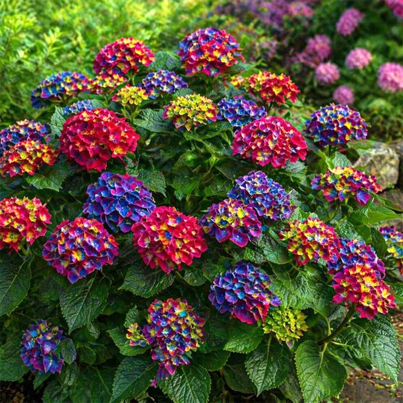 Det här är inte en hortensia för den som vill ha något diskret. Den är till för dig som vill ha ett samtalsämne i trädgården. Färgkombinationen rött, lime och blått är unik i växtvärlden och ger en nästan exotisk känsla.