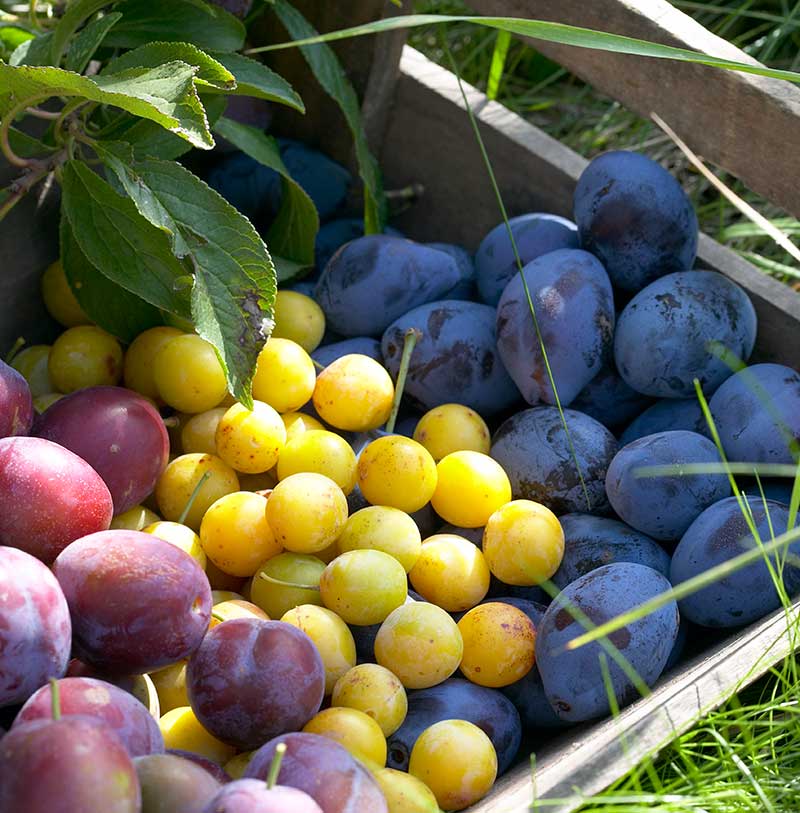 Frukterna är söta, välsmakande och saftiga med ett rödviolett skal. Passar både till bak och att ätas direkt.