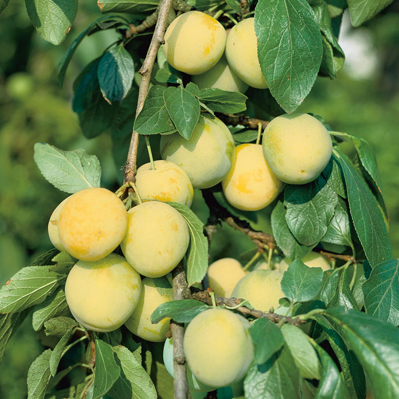Ett gulgrönt, stort, klotformat plommon med mycket saftig och sött fruktkött