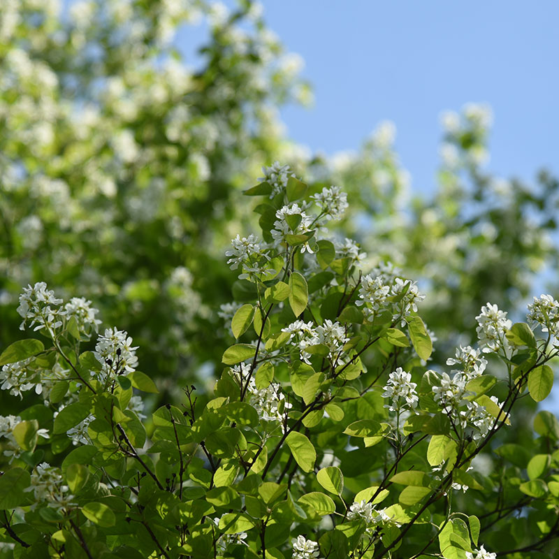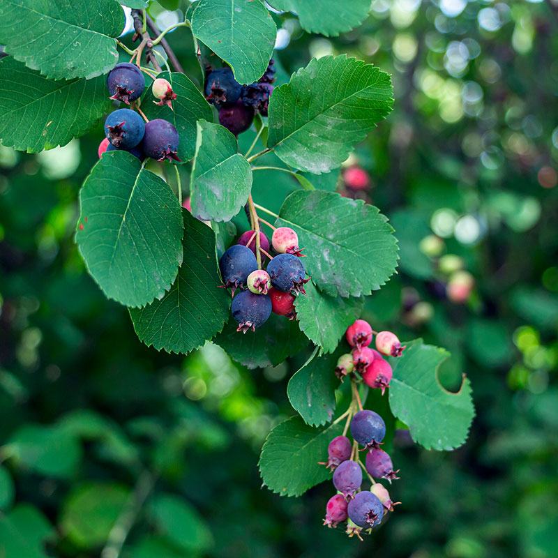 Amelanchier alnifolia, eller bärhäggmispel som den kallas på svenska, är en mångsidig och tålig växt som är populär att använda som häck. Den är känd för sin snabbväxande karaktär och förmåga att skapa en vacker, tät häck med ett naturligt och vildvuxet utseende. På våren täcks busken av vackra vita blommor som attraherar pollinerande insekter. På sommaren bildas ätliga, blåsvarta bär som älskas av både fåglar och människor. Bären är rika på vitaminer och antioxidanter och kan användas i matlagning, exempelvis till sylt eller saft. Samtidigt fungerar de som en viktig matkälla för fåglar under sensommaren och hösten. På hösten bjuder denna häck på en spektakulär färgprakt med glödande gula och orangea blad. Lämplig som friväxande men kan beskäras utan problem även om det oftast räcker med att gallra lite för att bibehålla en naturlig form.