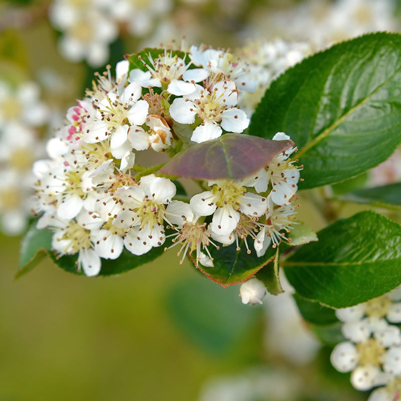 Aronia melanocarpa 'Elata', även känd som slånaronia, är en robust och lättodlad häck som bjuder på en spektakulär show genom alla årets säsonger. På våren täcks busken av små, vita blomklasar som står i vacker kontrast mot det friskt gröna bladverket och lockar pollinerande insekter.