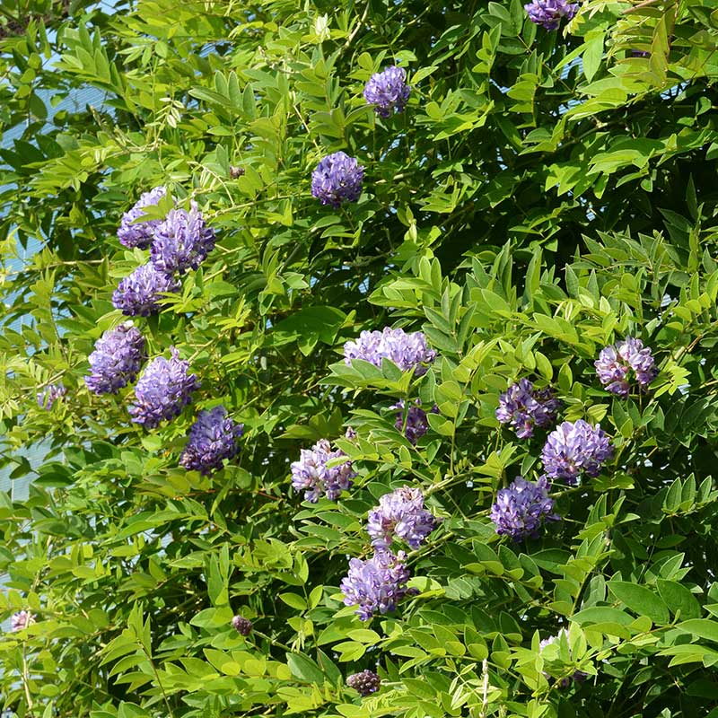 Detta är det perfekta valet för en mindre trädgård eller om du vill ha ett blåregn på en spaljé vid en uteplats. Den ""tar inte över"" hela huset, och de djupt purpurlila, kompakta klasarna är otroligt vackra mot det gröna bladverket. Den blommar dessutom när de flesta andra blåregn redan har blommat över, vilket förlänger säsongen.