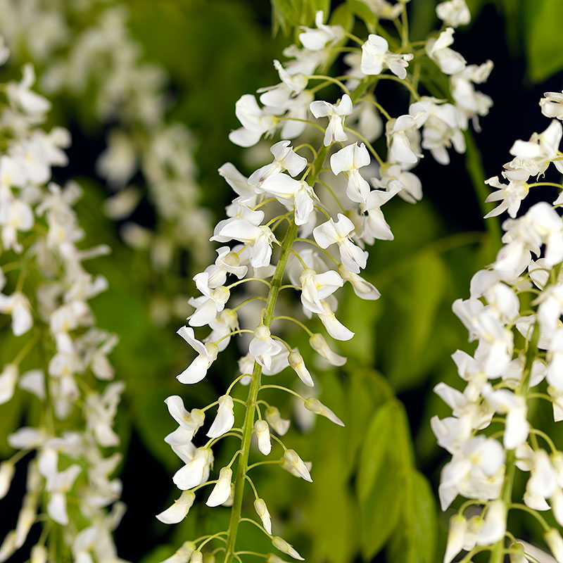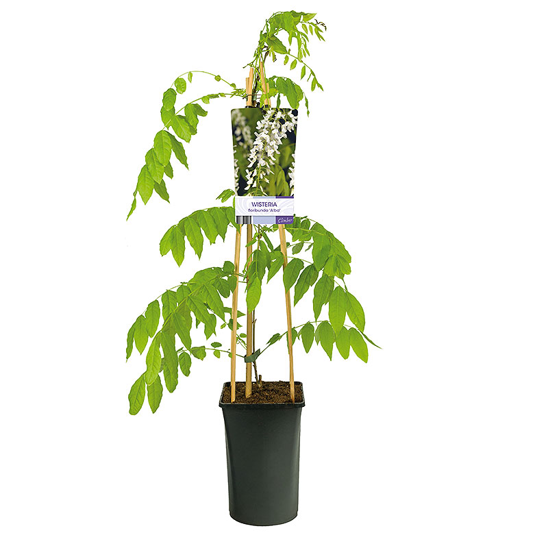 Wisteria floribunda 'Alba' är en elegant vitblommig japansk blåregn. Kommer från Japan. Blommar rikligt med vita ärtblommor som är samlade i upp till 60 cm långa hängande klasar under maj-juni. Älskas av fjärilar, bin och humlor. Sorten passar perfekt för att växa mot en solig vägg. Bladen är ljusgröna och blir vacker gult bronsade på hösten. Sorten passar utmärkt för att växa på spaljé mot en solig vägg eller i pergola.