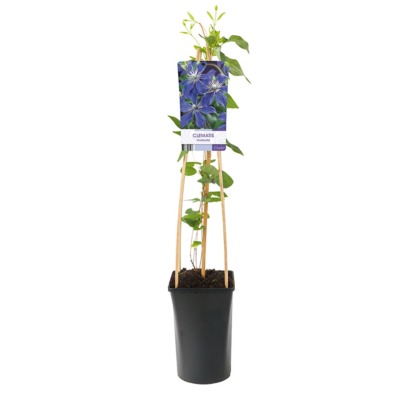 Typ: Klätterväxt Trivs i läge: Sol-halvskugga Jordmån: Näringsrik, mullrik och väldränerad Blomfärg: Blåviolet med rödlilla strimma Blomningstid: Maj-Oktober Färdig höjd: 100-150 cm Härdighet zon: 1-5 Krukstorlek: 14-16 cm Ungefärlig leveranshöjd: 40-60 cm Vetenskapligt namn:Clematis 'Arabella' Antal/förpackning: 5