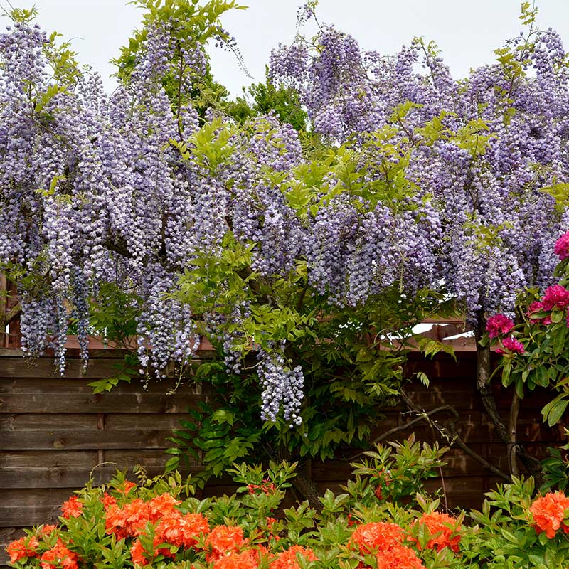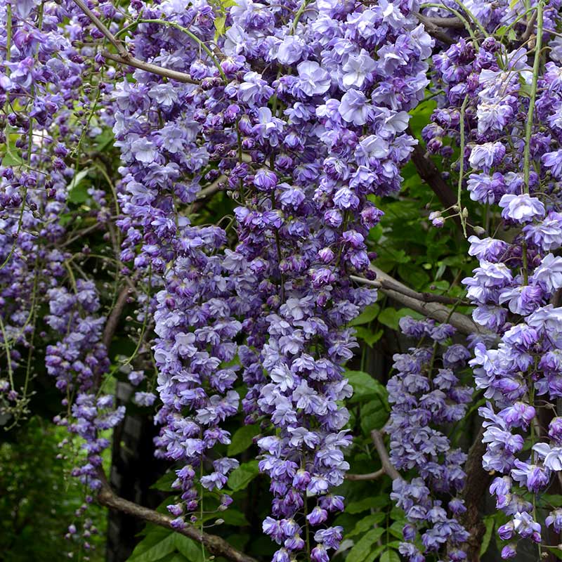 Kuriosa! Blommorna på 'Violacea Plena' är så tunga och täta att de nästan ser ut som druvklasar på håll. Den mörka, djupt lila färgen är dessutom bland de mörkaste man kan hitta hos blåregn, vilket gör att den verkligen ""poppar"" mot ett ljust hus eller en grön bakgrund.