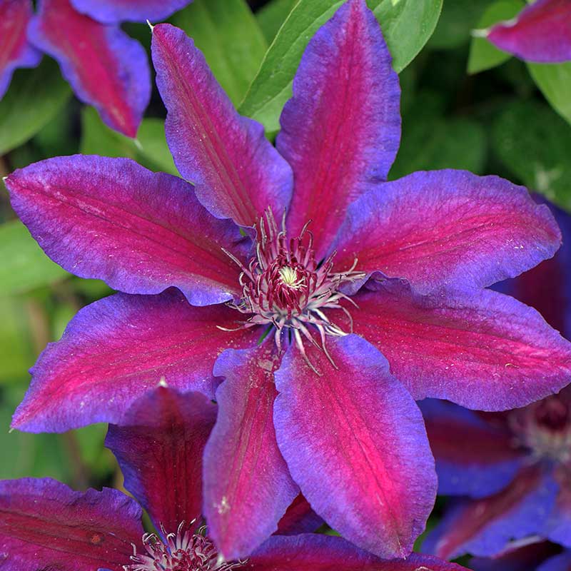 Klematis 'Akaishi' är en underbart storblommig (15-20 cm) klematis från Japan med enkla, purpurröda blommor med strimmor av cerise mot mitten. Kronbladens kanter är lätt vågiga. Ståndarknapparna är rosa med silverinslag. Mycket attraktiv.