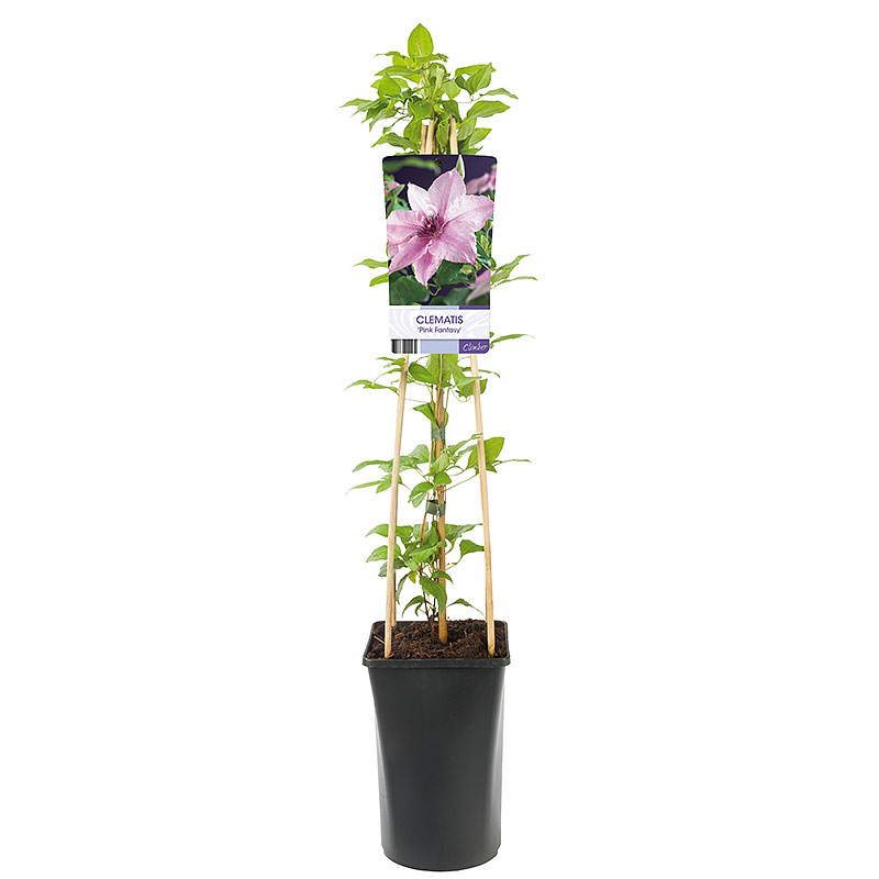 Klematis 'Pink Fantasy' blommar med stora (11 cm), ljusrosa blommor, med mörkare rosa streck i mitten av varje kronblad och rödbruna ståndare. Passar perfekt att odla mot vägg, träd, mur eller spaljé. Kan även odlas i kruka på en balkong eller terrass.