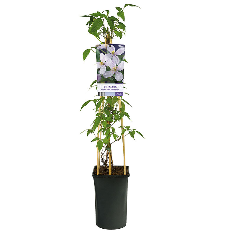 Klematis 'Pink Perfection' är en sort med små, rosa och enkla blommor som blommar under juni-juli. Skydda rothalsen på våren mot sol och på vinter mot kyla. Har en fint doft. Passar perfekt att odla mot vägg, träd, mur eller spaljé.