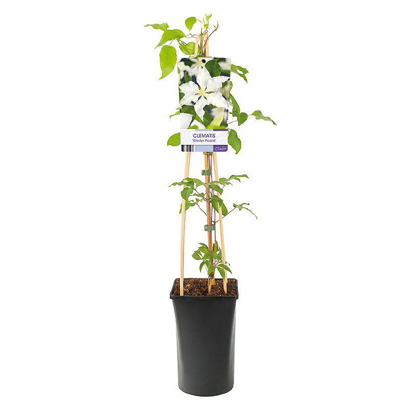 Typ: Klätterväxt Trivs i läge: Sol-halvskugga Jordmån: Näringsrik, mullrik och väldränerad Blomfärg: Vita Blomningstid: Juni-September Färdig höjd: 250-300 cm Härdighet zon: 1-4 Krukstorlek: 14-16 cm Ungefärlig leveranshöjd: 40-60 cm Vetenskapligt namn:Clematis 'Gladys Picard' Antal/förpackning: 5