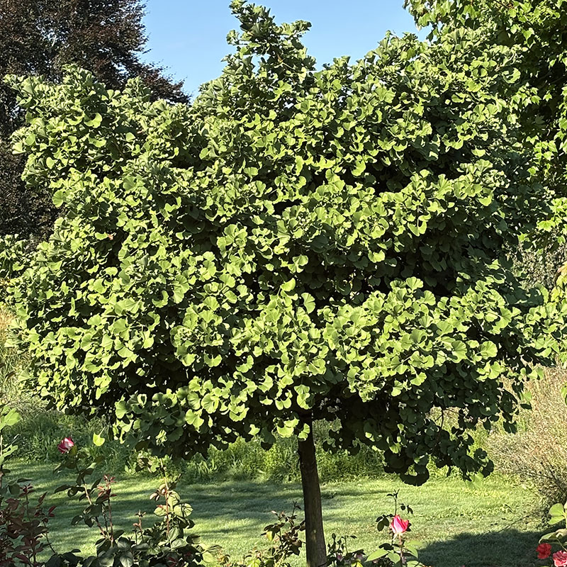 Ginkgo biloba 'Mariken' är en unik, kompakt sort av Ginkgo biloba som är en av världens äldsta trädarter med anor från dinosauriernas tid. Denna dvärgform är idealisk för moderna trädgårdar och urbana miljöer där man vill ha ett dekorativt, långlivat träd i liten skala. Växtsättet är tätt och rundat, med en höjd på cirka 1–2 m och bredd 1,5–2 m, vilket gör den perfekt för små ytor, krukor eller som solitär i rabatter. Ginkgo är ett lövfällande barrträd, vilket gör den botaniskt unik. De karaktäristiska, solfjäderformade bladen är friskt gröna under sommaren och får på hösten en intensivt gyllengul färg, ett av sortens främsta prydnadsvärden. Denna sort levereras som hanplanta, vilket innebär att den inte bildar några frukter. Tillväxten är långsam, och 'Mariken' förblir låg och bred snarare än hög, med en jämn och kompakt form. Den långsamma tillväxten gör sorten lättskött och idealisk för mindre ytor. Ginkgo biloba 'Mariken' trivs bäst i varmt, skyddat och soligt läge men klarar även halvskugga, är tålig mot luftföroreningar, sjukdomar och skadedjur. Den klarar stadsmiljöer mycket väl och är ett pålitligt val även på utsatta platser. Ginkgo biloba 'Mariken' passar utmärkt som solitär, i kruka, på innergårdar och i arkitektoniska planteringar, där man vill ha ett kompakt, formstarkt träd med spektakulär höstfärg och minimalt skötselbehov. Beskärning behövs sällan. Vid behov kan lätt formning eller borttagning av enstaka grenar göras under JAS-perioden (juli–september) eller tidig vår. Trädets naturliga form bör bevaras.