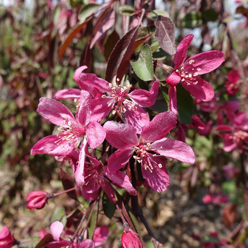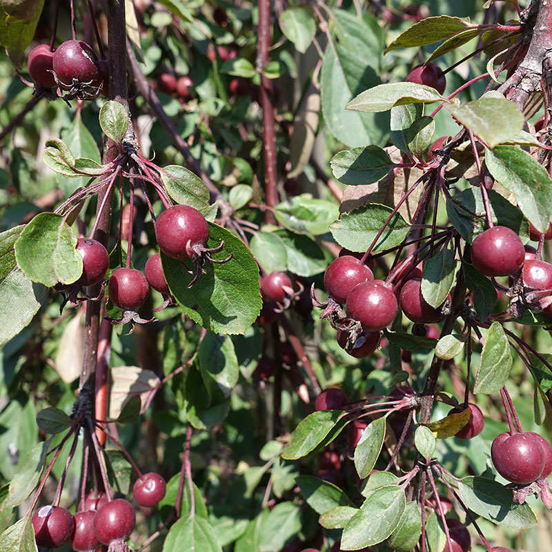 Malus 'Royal Beauty' är ett mycket dekorativt prydnadsäpple med ett unikt, hängande växtsätt som ger trädet ett elegant och uttrycksfullt formspråk. Sorten är särskilt uppskattad för sin kombination av vacker blomning, dekorativa blad och långvarigt fruktprydnadsvärde. Trädet är litet till medelstort och har ett uttalat hängande, paraplyformat växtsätt, där grenarna böjer sig mjukt nedåt och skapar ett gracilt intryck. Under våren blommar Malus 'Royal Beauty' rikligt med djupt rosaröda till purpurröda blommor, ofta i knoppstadiet ännu mörkare. Blomningen följs av mörkt purpurröda blad, som behåller sin färg väl under sommaren. Senare på säsongen utvecklas små, mörkröda äpplen som sitter kvar långt in på hösten och ibland även under vintern, vilket ger trädet ett fortsatt högt prydnadsvärde och samtidigt gynnar fågellivet. Sorten trivs bäst i soligt läge, där blomning, bladfärg och fruktsättning blir som mest intensiv. Den är relativt anspråkslös men föredrar väldränerad, näringsrik jord. Malus 'Royal Beauty' passar utmärkt som solitärträd, i parker, förgårdsmiljöer och representativa planteringar, där man vill skapa ett starkt visuellt uttryck under stora delar av året.