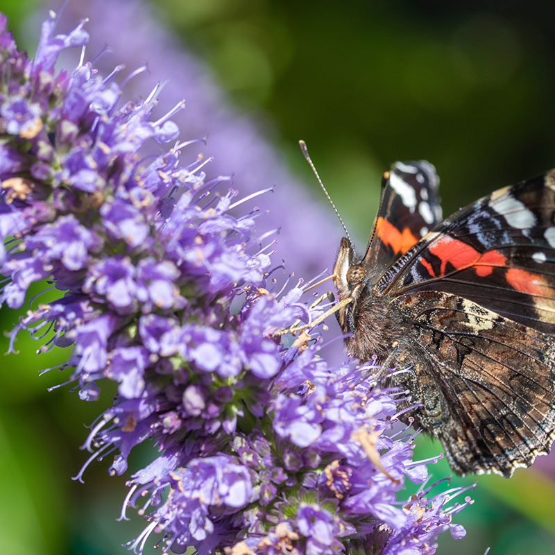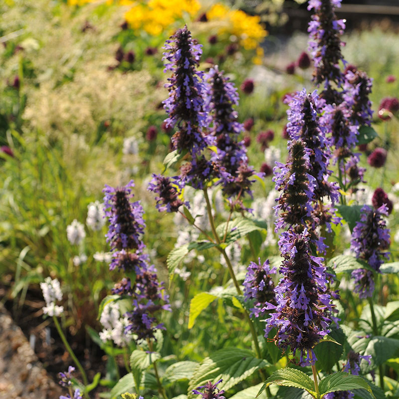 Agastache 'Black Adder' är en kraftfull och långblommande perenn som snabbt blir en blickfångare i trädgården. Med sina djupvioletta knoppar som öppnar sig i mjukt lavendelblå toner skapar den ett fascinerande färgspel hela sommaren och långt in på hösten. De täta, upprätta blomaxarna lockar mängder av fjärilar, bin och humlor, vilket gör den till en ovärderlig växt i alla trädgårdar där biologisk mångfald prioriteras. Sorten är robust, värmetålig och lättodlad, trivs i soliga lägen och väl dränerad jord, och bjuder på en imponerande blomningsperiod från juni till september. Den aromatiska växten avger dessutom en lätt anisdoft som förstärker den sensuella upplevelsen vid varje förbipassage. 'Black Adder' är lika vacker i rabatten som i naturinspirerade planteringar, och dess majestätiska höjd – omkring 70–90 cm ger struktur och elegans utan att kännas dominerande. Den är också en utmärkt snittblomma som står länge i vas.