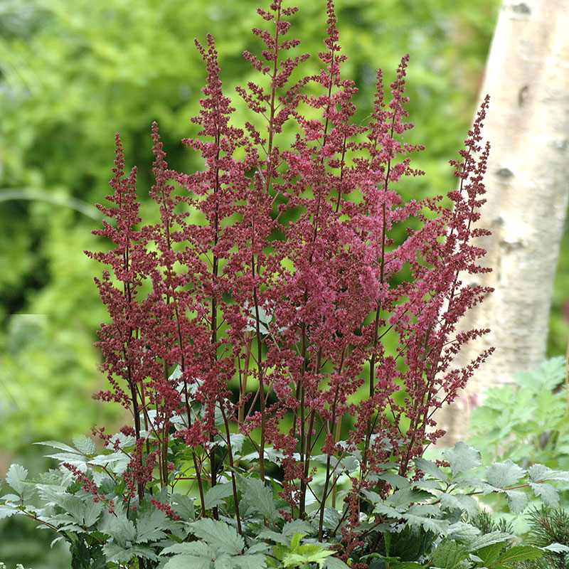Sorten 'Ardensii Etna' blommar med djupröda, fjäderlika plymer under senare delen av sommaren.Passar bra i rabatt tillsammans med andra växter.