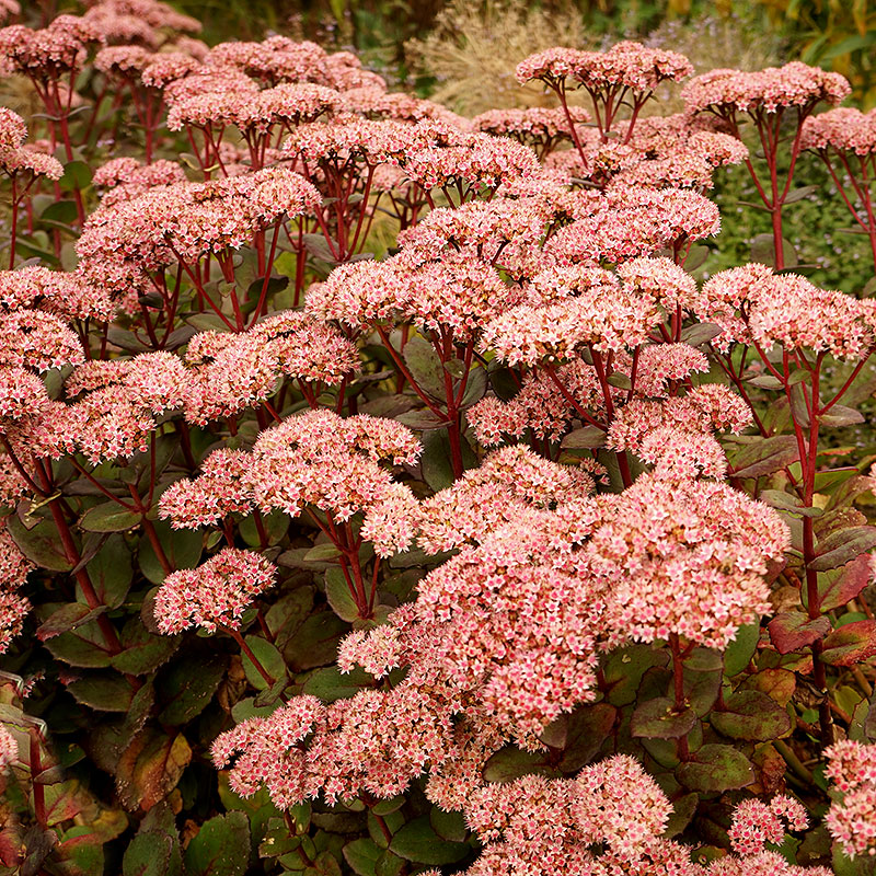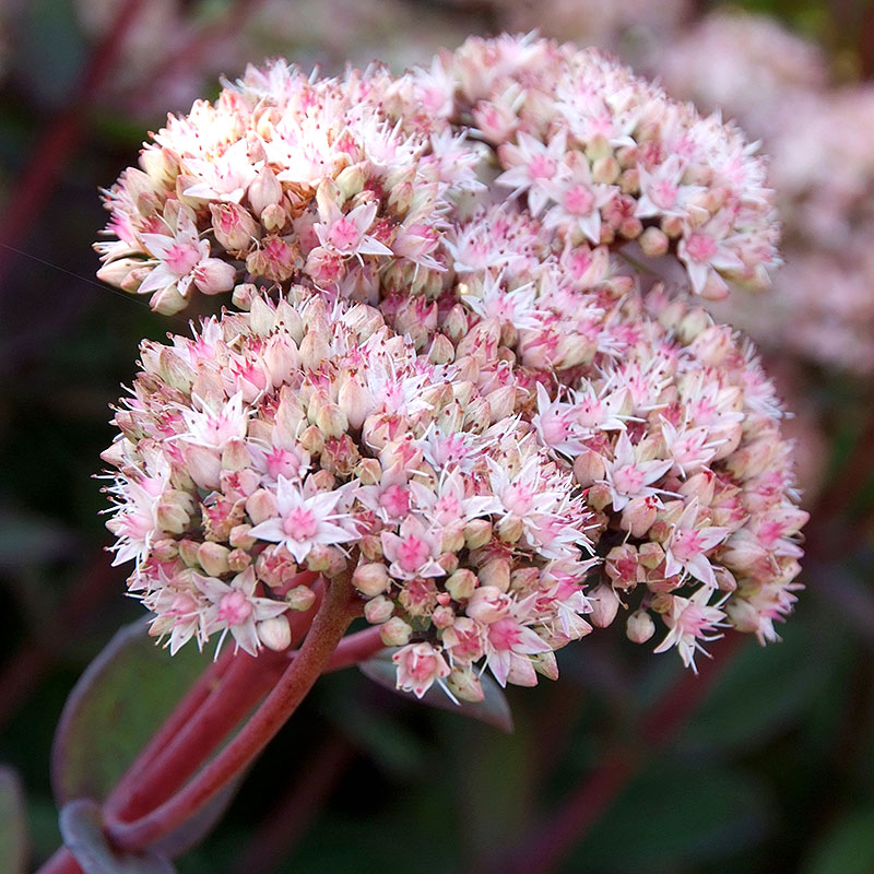 De purpurröda blommorna sitter i stora, lätt välvda klasar.