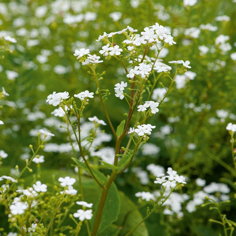 Brunnera macrophylla 'Betty Bowring', även kallad kaukasisk förgätmigej, är en elegant perenn som förgyller skuggiga hörn av trädgården med sina rena, vita blommor. Under april–juni svävar de små, förgätmigej-liknande blommorna över ett frodigt bladverk av hjärtformade, gröna blad. Den är perfekt som marktäckare i woodland, under buskar eller längs gångar, där den skapar en romantisk och lugn atmosfär.