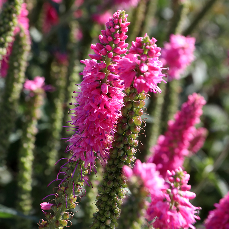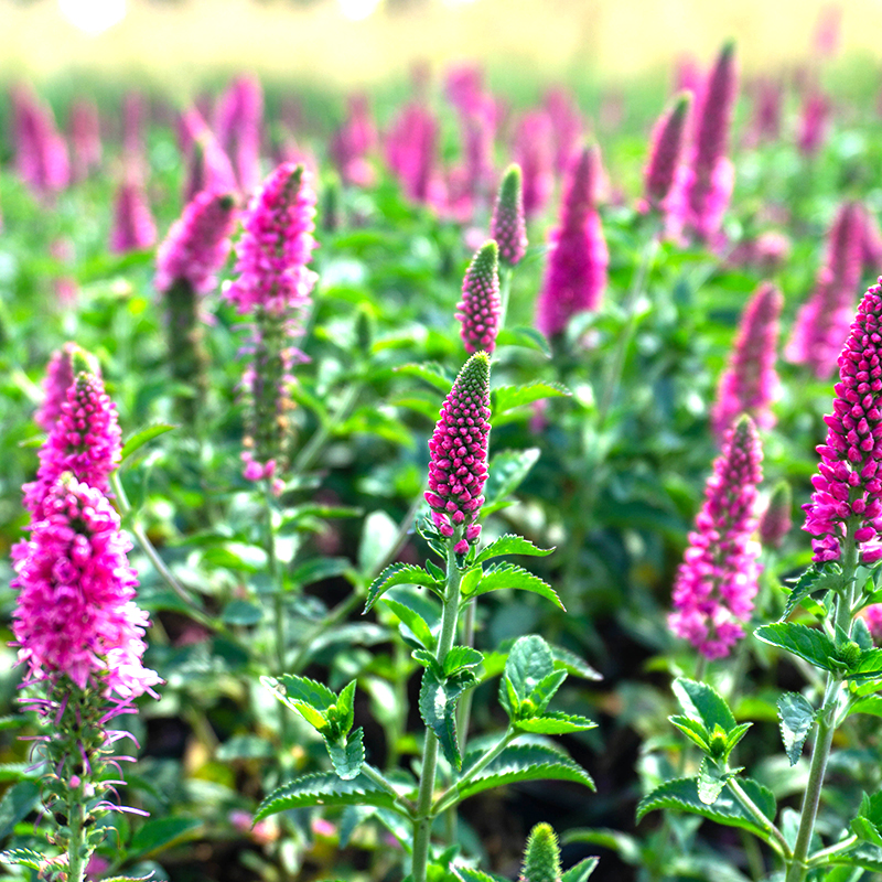 Hällveronika 'FIRST LOVE' är en perenn med stadigt buskigt växtsätt. Blommar med lysande mörkrosa ax. Bladen är mörkgrönt lansettformade. Passar utmärkt till solig rabattkant, kruka eller stenparti, även fin som snittblomma. Gillas av fjärilar, humlor och bin. Blommar i juli till september. Trivs i sol på måttligt näringsrik, väldränerad och normalfuktig jord.
