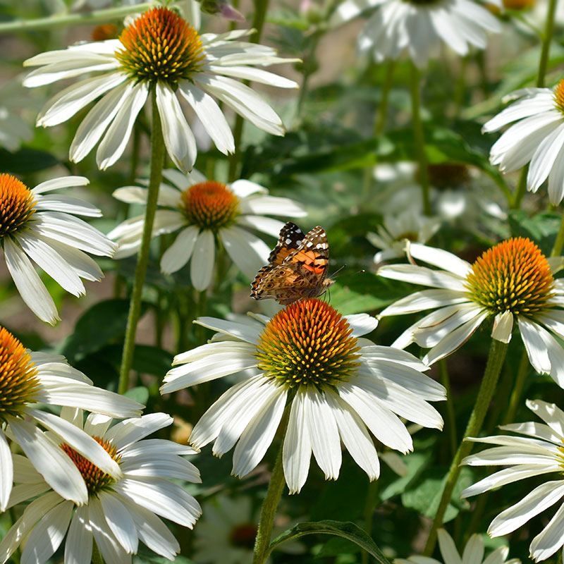 En elegant vit rudbeckia med tydlig mittkon och stadigt växtsätt. Blommar länge och är mycket uppskattad av bin och fjärilar. Ger höjd, form och ett modernt uttryck i rabatten.