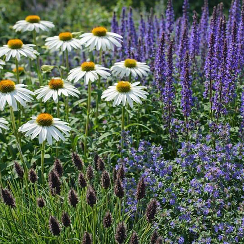 Skapa en modern, harmonisk och lättskött plantering för sol med detta noggrant sammansatta perennpaket. Kombinationen av vita rudbeckior, mörkstjälkade salvior, mjukt blå nepeta och elegant gräs ger en färgstark men lugn rabatt med tydlig struktur och blomning från tidig sommar till höst. Paketet är perfekt för soliga lägen där du önskar en plantering som både är robust och rik på pollinatörer. Med sina kontraster mellan strama grässtrån, stadiga blomax och rundade blommor skapas en dynamisk rabatt med hög visuell kvalitet, lika vacker i offentlig miljö som i privata trädgårdar. Detta paket täcker ca 12 m² för en tät plantering, eller 14–16 m² om du vill att växterna växer in över tid.