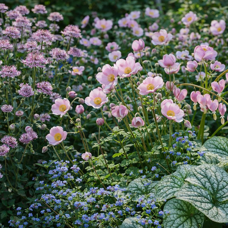En klassisk höstanemon med ljusrosa blommor och ett lätt, dansande växtsätt. Blommar länge under sensommar och höst och skapar ett ljuvligt, svävande inslag i rabatten.