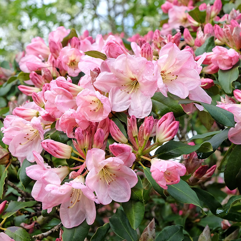 En elegant och mångsidig sort som charmar med sina blomfärger i mjuka pastelltoner. Blommorna börjar som ljusrosa eller persikofärgade knoppar och övergår gradvis i olika nyanser av krämvitt, aprikos och rosa, vilket skapar en fantastisk färgförändring under blomningen. De klockformade blommorna är samlade i stora, rundade kluster som ger en imponerande blomsterprakt under sen vår. Busken har ett tätt, välformat växtsätt och når en höjd på cirka 1 meter. De mörkgröna, vintergröna bladen framhäver blommornas färgskiftningar och ger busken ett frodigt utseende året om. Rhododendron Percy Wiseman är både tålig och lättskött, trivs i halvskuggiga lägen och kräver sur, väldränerad jord. Dess mångfald av färger och kompakta form gör den idealisk för både små trädgårdar och större landskapsplanteringar.