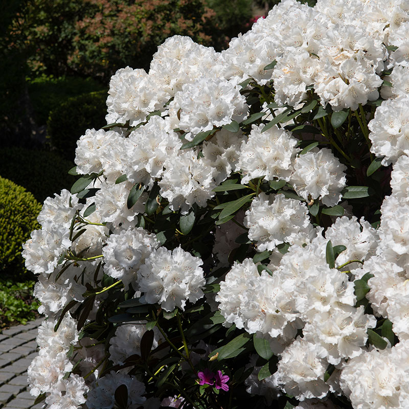 En förtrollande sort med silvriga knoppar som övergår till imponerande stora vita blommor med rosa nyanser. De klockformade blommorna har mjukt vågiga kanter som ger en elegant och luftig känsla. Blomningen är riklig och skapar en storslagen vit blomsterprakt som lyser upp trädgården. Busken är kompakt och välförgrenad, och når en höjd och bredd på cirka 1 meter. Dess mörkgröna, vintergröna blad ger en vacker kontrast till de ljusa blommorna och gör att växten behåller sin charm året runt. Rhododendron Schneekrone är relativt tålig och föredrar ett skyddat läge med väldränerad, sur jord för att blomstra som bäst. Kan planteras i soliga lägen och ändå trivas men behöver då vattnas eller täckas över tidigt på våren för att förhindra att vårsolen bränner bladen.