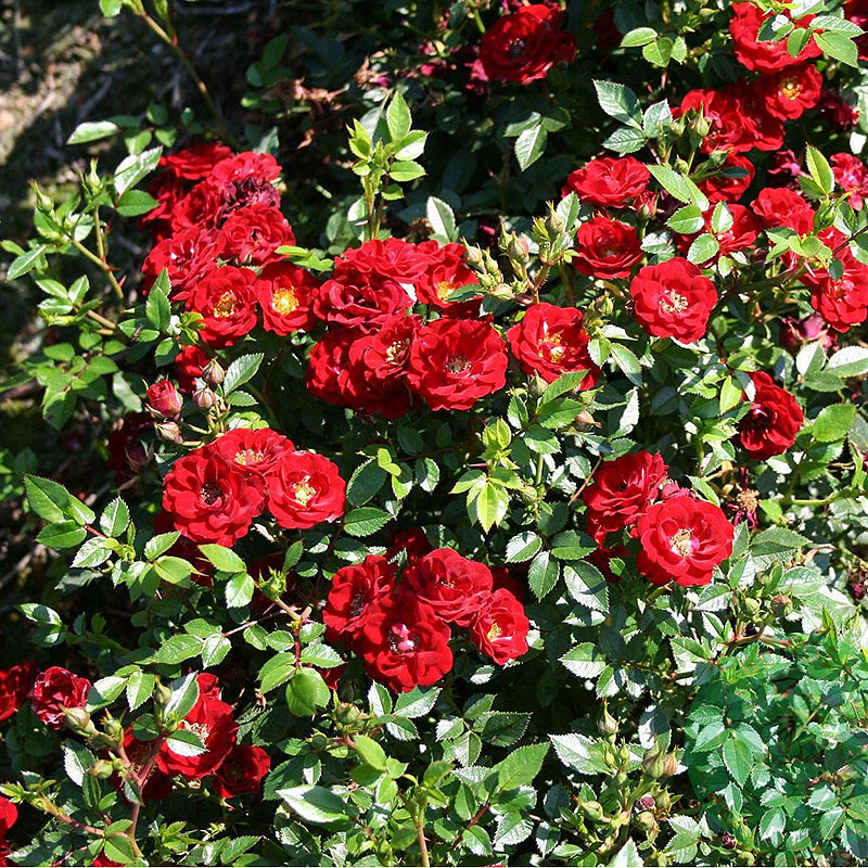Rosa 'Peter Pan' är en marktäckande ros med tätt, brett växtsätt som blir ca 30 till 50 cm hög. Bladen är gröna och halvblanka. Blommar rikligt med små, halvfyllda, mörkröda blommor som sitter i täta klasar. Blommar från juni till oktober med svag doft. Passar att plantera som marktäckare eller som låg häck. Beskär på våren. Underbar sort att ha i en stor kruka på balkong eller terrass. Trivs bäst på en solig växtplats. För bästa utveckling placera den gärna i näringsrik, mullrik och väldränerad jord.