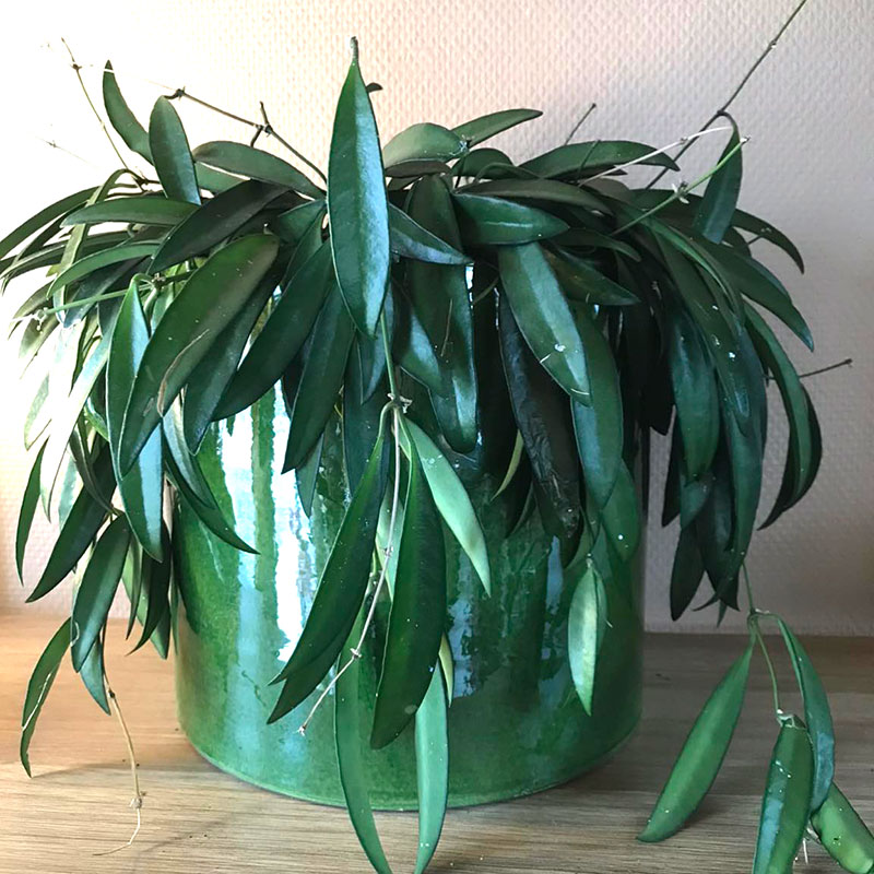 Hoya wayetti har fina, lansettlika blad. Passar bra i ampel där grenarna får hänga. Blommar med små rosa blommor.