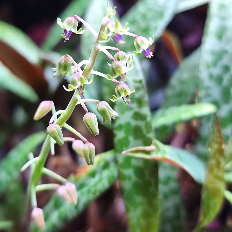 Blommor växer ur mitten av löken och bildar en spira med en mängd små klockor med nyanser av grönt med rosa och lila.
