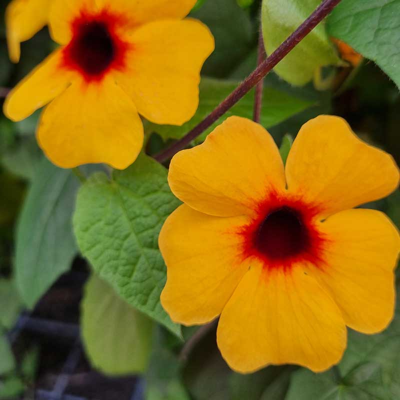 Slingerväxt med grönt fint bladverk till sina terracotta färgade blommor med mörk mitt. Svartöga är en mycket allsidig och användbar prydnadsväxt. Det frodiga växtsättet gör att Svartöga kan användas både till ampelplanteringar och större planteringskärl.
