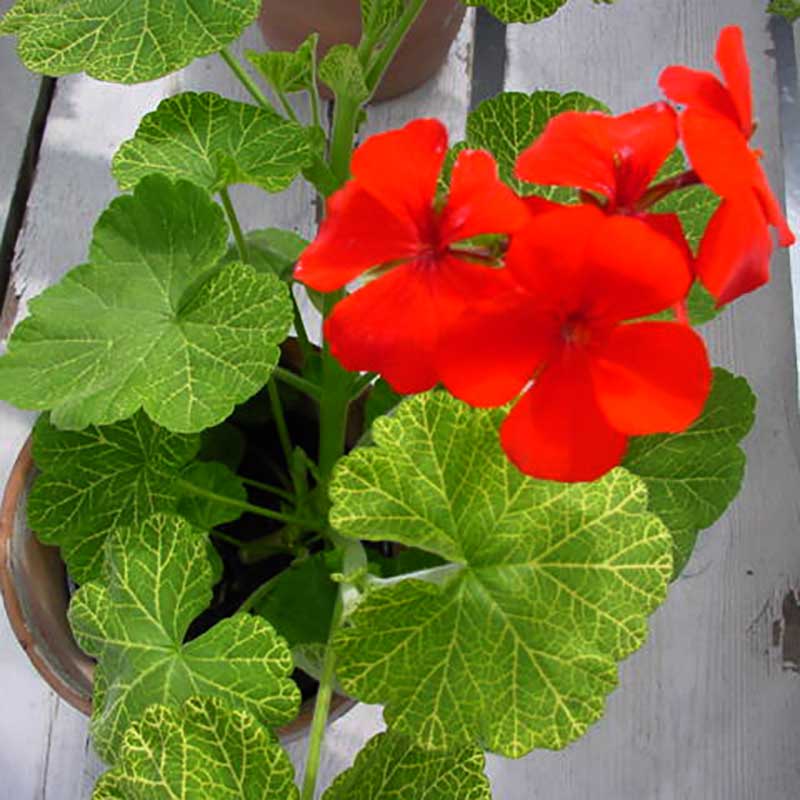 'Wantirna', är en lite speciell och relativt ovanlig pelargon med starkt röda, enkla blommor och ljust gröna blad med mosaikvirus, dvs. bladen täcksa av fina, vita streck.