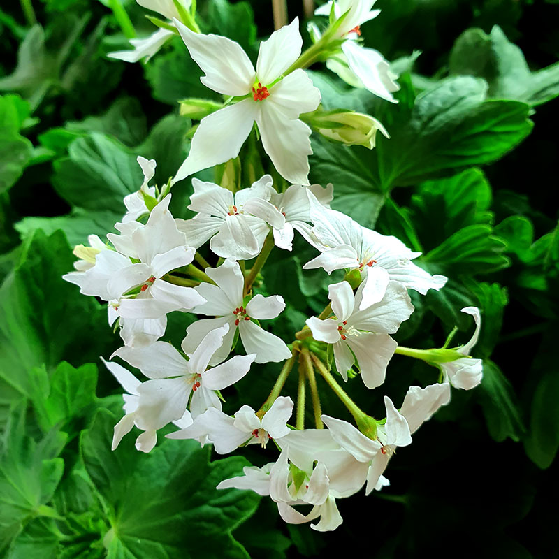 Vetenskapligt namn: Pelargonium x hortorum 'Fireworks White'.