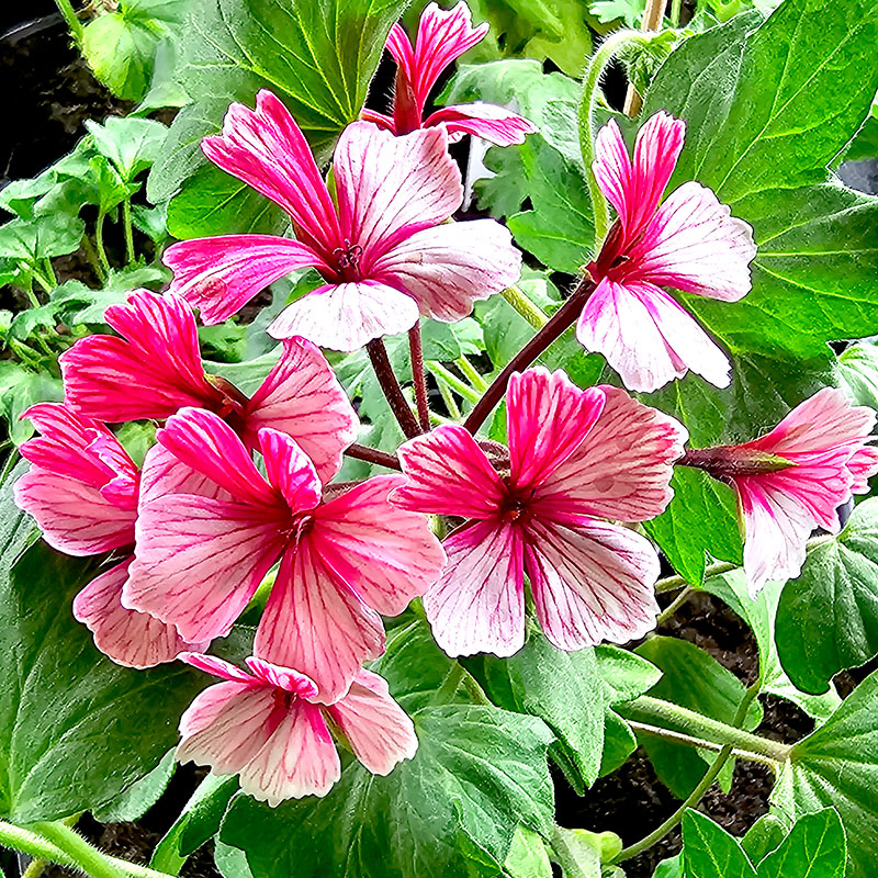 'Kelette' är enkelblommande stjärnpelargon med mycket speciell utfärgning av kronbladen som har en vit till rosa grundfärg med tydliga ömörkt ceriserosea strimmor längs nerverna.