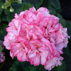 'Unicorn Monday Morning' (L. Ljungquist) är en zonalpelargon med äggskalsblommande, nästan rosenknoppslika blommor i rosa och vitt.