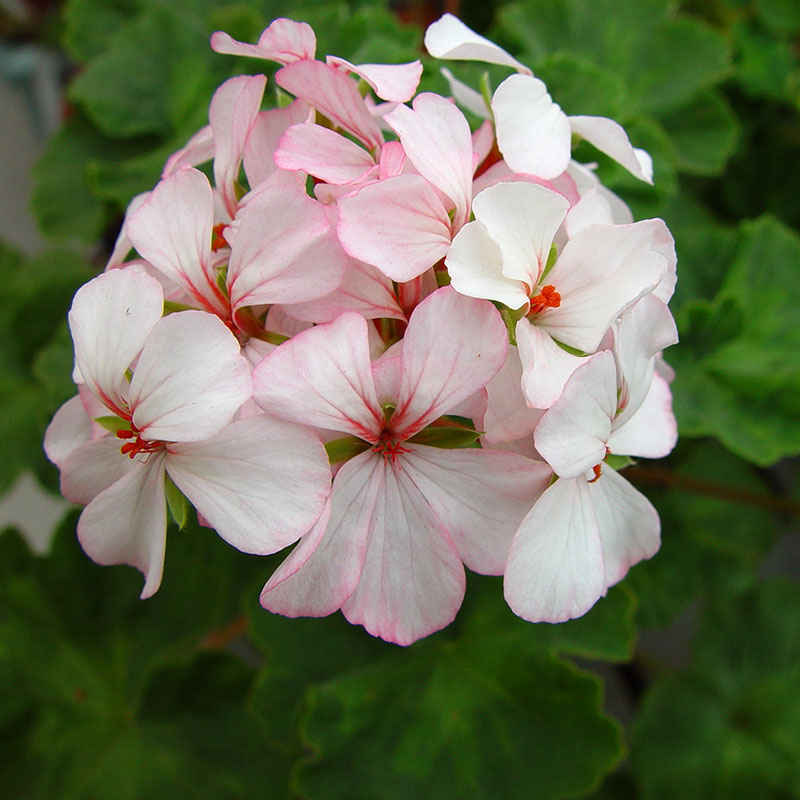Pelargonen 'Anna Backlunds Lilla Vita' är en zonalpelargon med enkla, vita blommor med rosa ton som blir mer intensiv närmast blommans mitt.