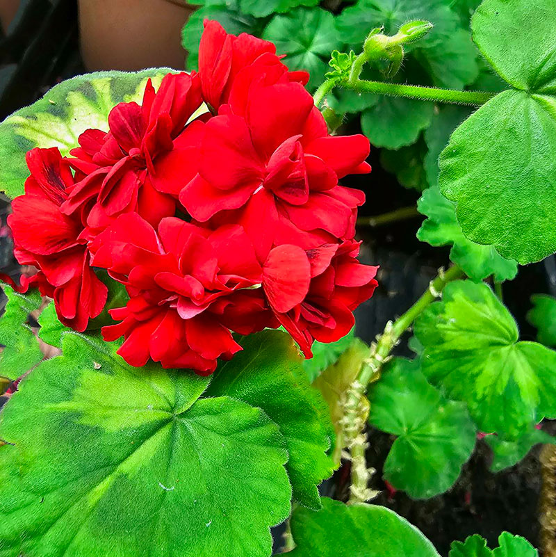 Detta är en variant av den klassiska röda rosenknoppspelargonen där bladen har ett ljusgrönt till gult fjärilsmärke.