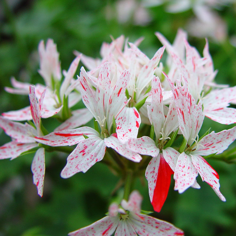 En utsökt sort med enkla blommor där botten är rent vit beströdd med fläckar, streck och oregelbundet stora fält i en varmröd nyans.