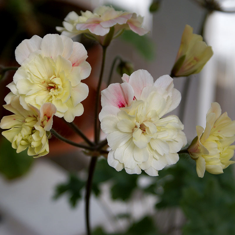'Unicorn Sunbeam' (Blackman/Ljungquist) är en zonarticpelargon med dubbla, gula till cremevita blommor med rosa inslag.