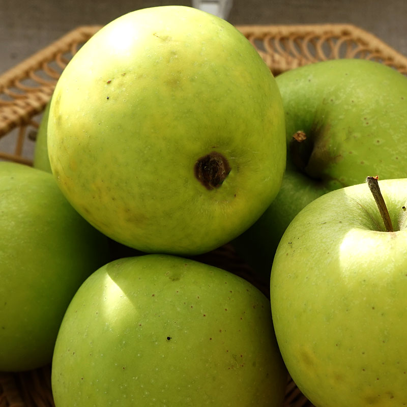 Sorten får gula till lätt röda frukter med bruna prickar. Utmärkt som matäpple. Medelsen, vacker blomning.