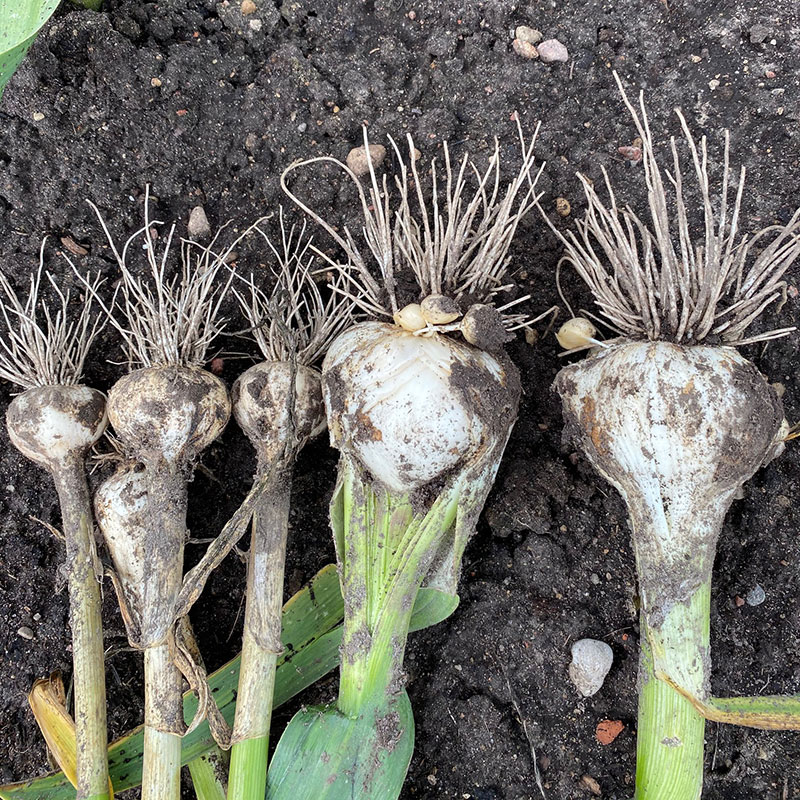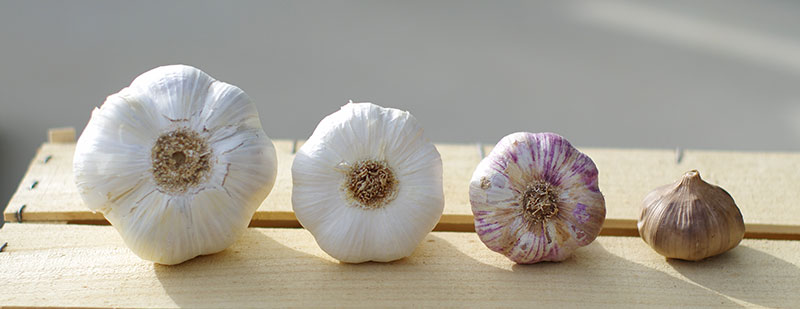 Jämförelse elefantvitlök till vänster med andra vitlökar till höger.