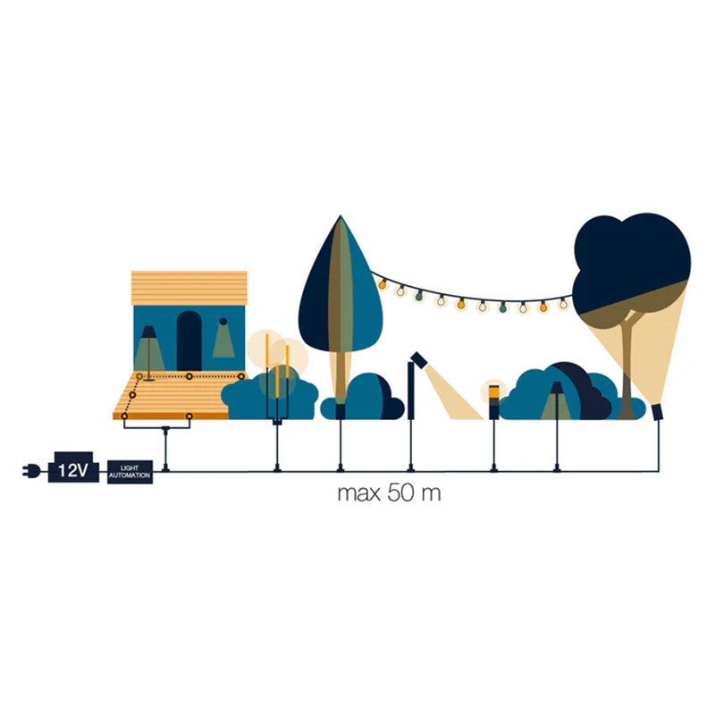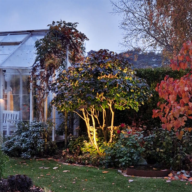 Lamporna avger ett varmvitt ljus som skapar en behaglig atmosfär och har en balanserad ljusspridning, perfekt för att belysa små till medelstora träd, buskar och ljusgenomsläppliga växter. Placera lampan centralt i växten för att skapa en magisk effekt med ljus och skuggor. För breda eller låga träd rekommenderas två lampor för en jämnare belysning.