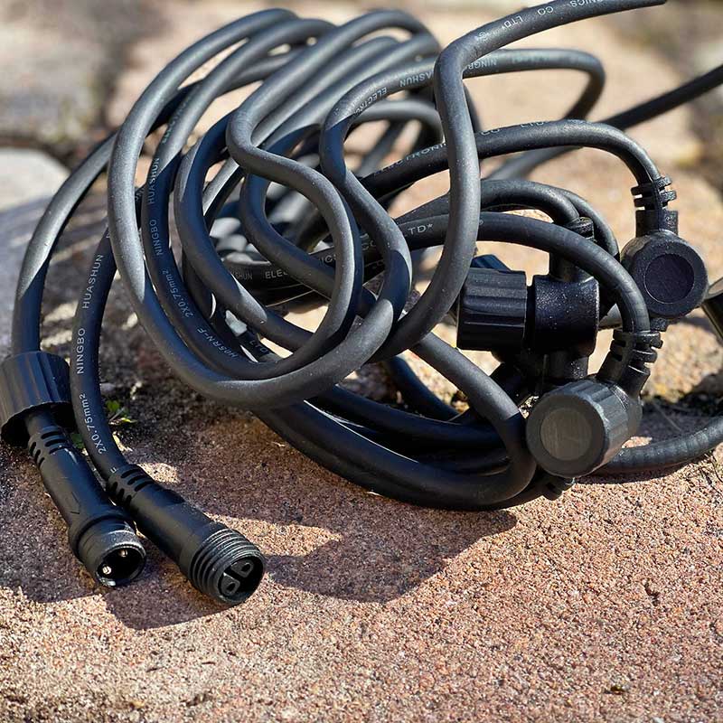 Med denna 5 meter kabel med grenkopplingar vid varje meter kan du enkelt kopplar dina lampor, fler kablar eller grenkopplingar. Flexibiliteten blir större då du inte behöver veta exakt vart lamporna ska sitta från början. Den är också perfekt där du har redan har lampor men vill kunna koppla på ljuslingor till jul eller fest. Ska du bygga trädäck eller staket med flera lampor i rad är denna typ av kabel att rekommendera. De uttag du inte använder pluggar du bara igen med medföljande gummpackning och skruvhatt.