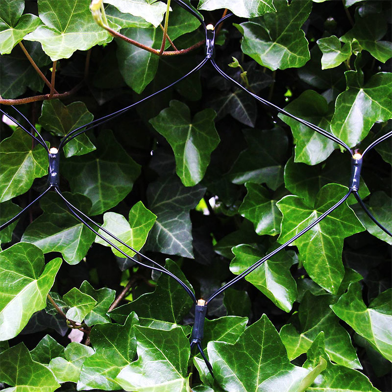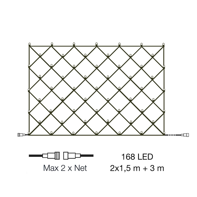 Net är ett dekorativt ljusnät (2x1.5m) med 168 varmvita LED ljuspunkter. 3 meter startkabel ingår. Du köper transformatorn separat.