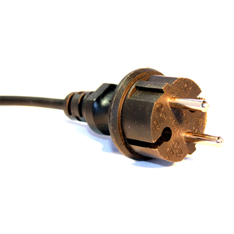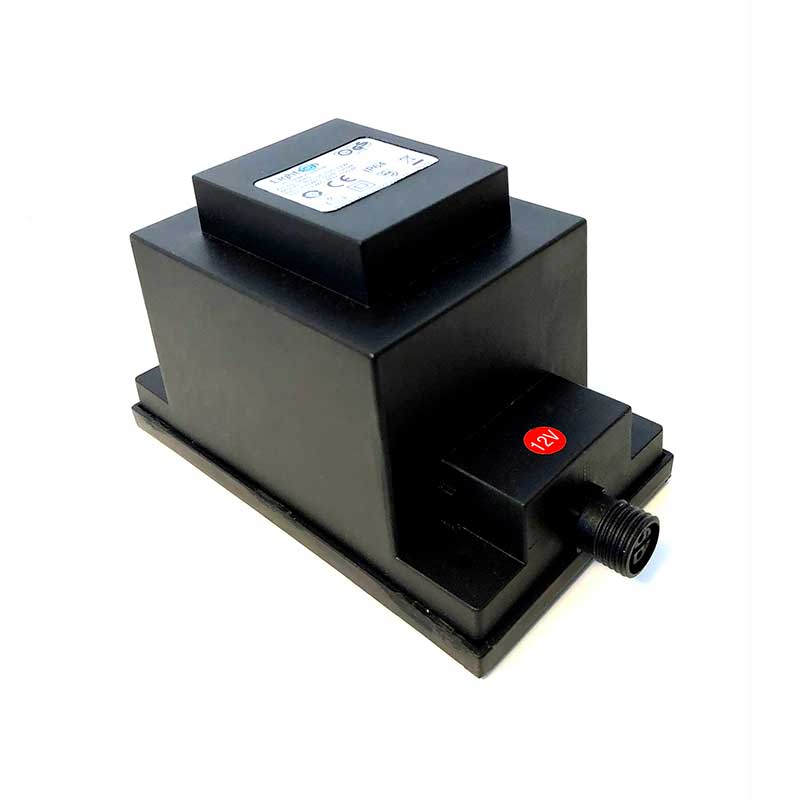 Transformatorn har ett 12 volt snabbkopplingsuttag i ena änden och en 2 meter lång sladd med stickkontakt i andra, som du sätter i ett vanligt vägguttag.