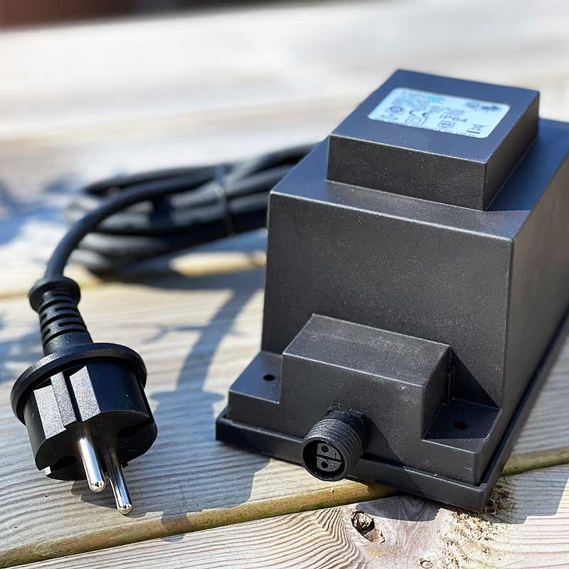 Transformator på 105 watt, som omvandlar 230 volt till 12 volt. Du behöver alltid en transformator i början av ditt Garden Plug & Play-system.
