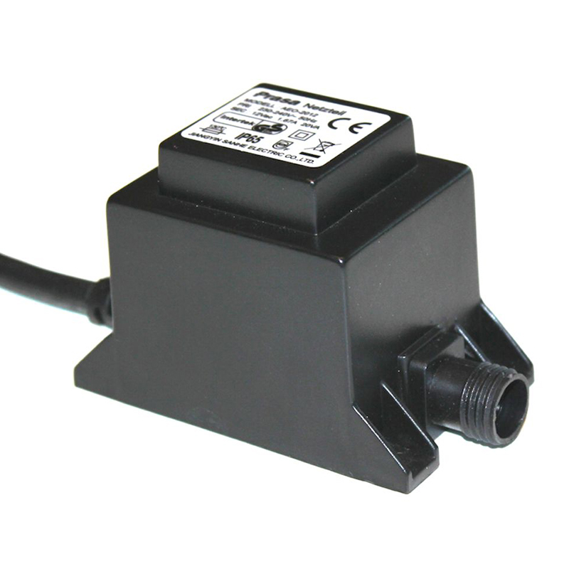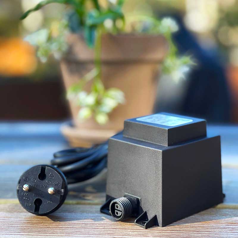 En mellanstor transformator på 60 watt, som omvandlar 230 volt till 12 volt. Du behöver alltid en transformator i början av ditt Garden Plug & Play-system.