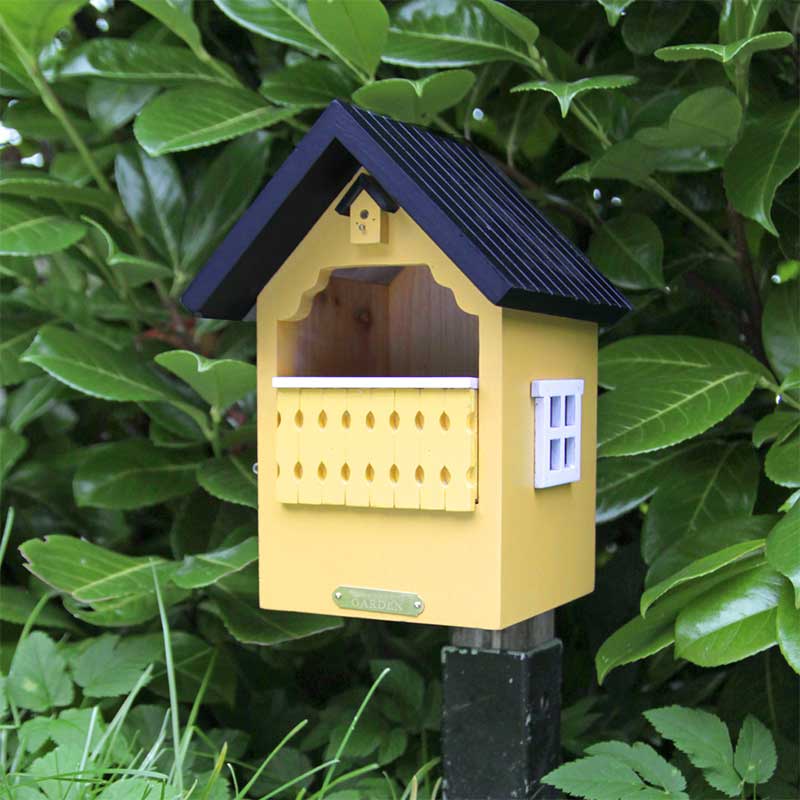 Den här holken är utformad för att passa ett gäng kräsna fåglar. Gärdsmyg, rödhake, sädesärla och flugsnappare vill nämligen ha en stor ingång, som släpper in ljus i holken.