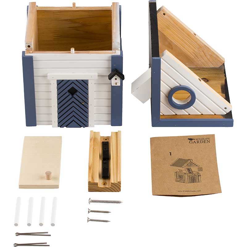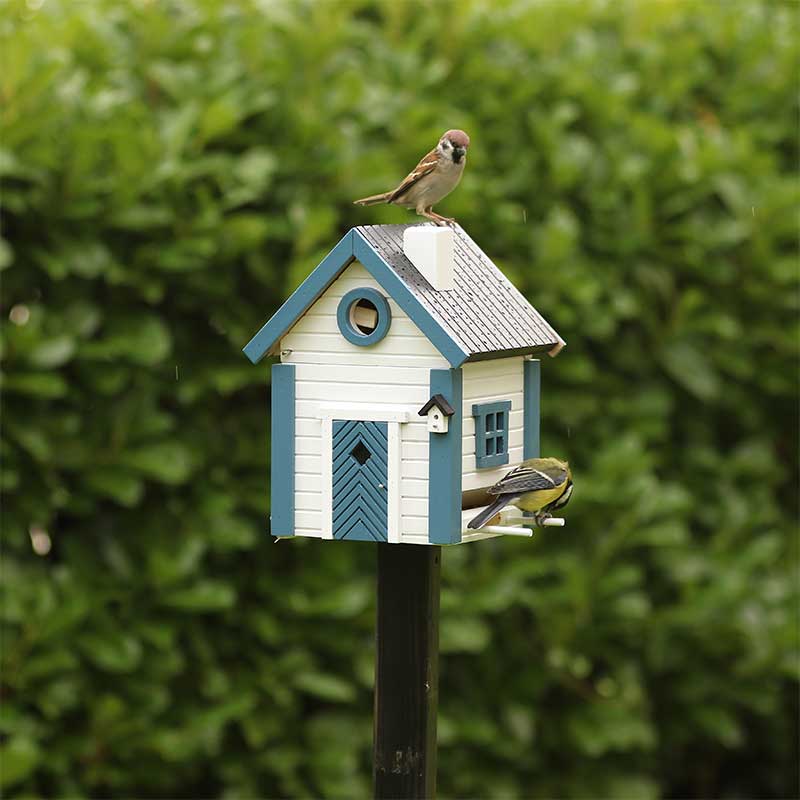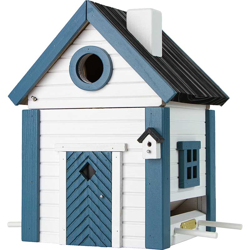 Multiholk Sjöboden är en kombinerad fågelholk och fågelbord i form av ett vitt hus med blå knutar. Den används som fågelbord under höst och vinter och som fågelholk under sommarhalvåret.