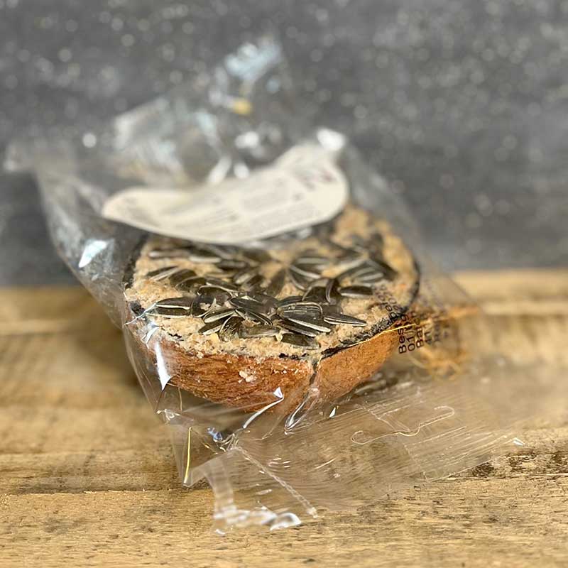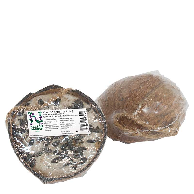 Fetthaltiga fröer inbakade i talg och spannmål i ett halvt kokosskal, en av naturens egna, snygga och hållbara förpackningar. Med snöre.