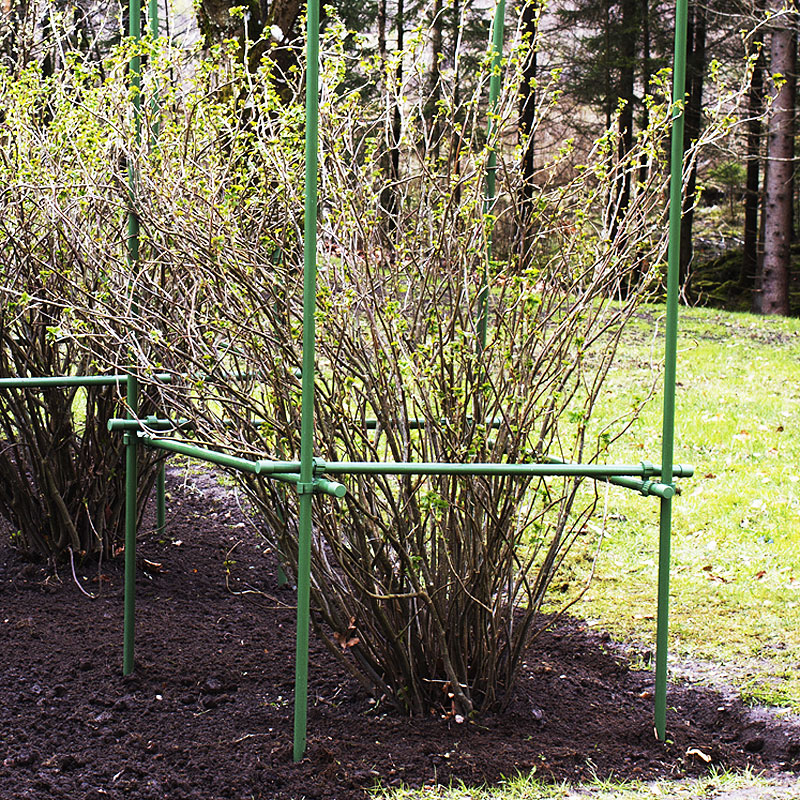 Buskstöd som samlar och lyfter grenarna. Hörnstolparna placeras på lämpligt avstånd från busken och de vågräta stolparna kan justeras i höjdled efter det att stödet monterats.