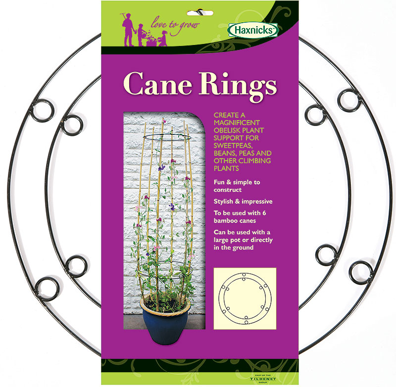 Med hjälp av dessa två stålringar med öglor skapar man med hjälp av 6 bambupinnar ett imponerande växtstöd.